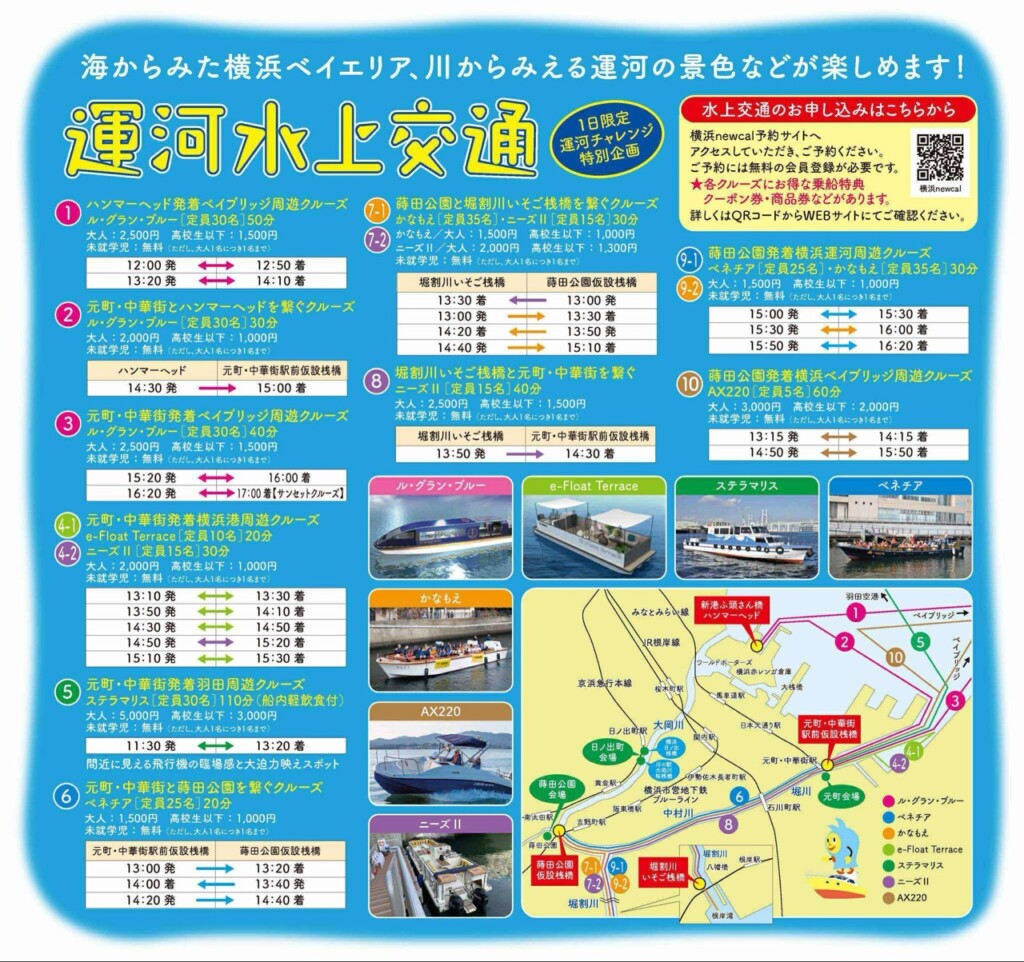 堀割川いそご桟橋行、元町中華街仮設桟橋行、運河周遊コース、蒔田公園から横浜ベイブリッジへの周遊クルーズをご用意しました。